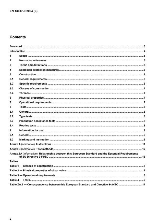 Relationship between this European Standard and the Essential Requirements of EU Directive 94/9/EC.16 Tables Table 1 — Classes of construction.7 Table 2 — Physical properties of shear valve.7 Table 3 — Operational requirements.8 Table 4 — Tests.9 Table ZA.1 — Correspondence between this European Standard and Directive 94/9/EC.17