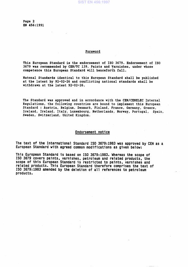 EN 456:1991 is a standard published by the European Committee for Standardization (CEN). Its full title is "Paints, varnishes and related products - Determination of flashpoint - Rapid equilibrium method (ISO 3679:1983, modified)". This standard covers: This International Standard specifies a method for determining the flashpoint o of a paint, varnish, paint binder, solvent, or a related product when the flashpoint is below 110°C