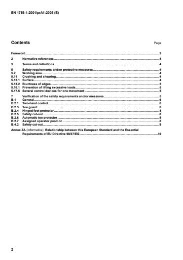 EN 1756-1:2001/prA1 is a draft published by the European Committee for Standardization (CEN). Its full title is "Tail lifts - Platform lifts for mounting on wheeled vehicles - Safety requirements - Part 1: Tail lifts for goods". This standard covers: Predominantly the demand for adding specific protective measures for toe guarding as described in clause B.2.3 of Annex B.