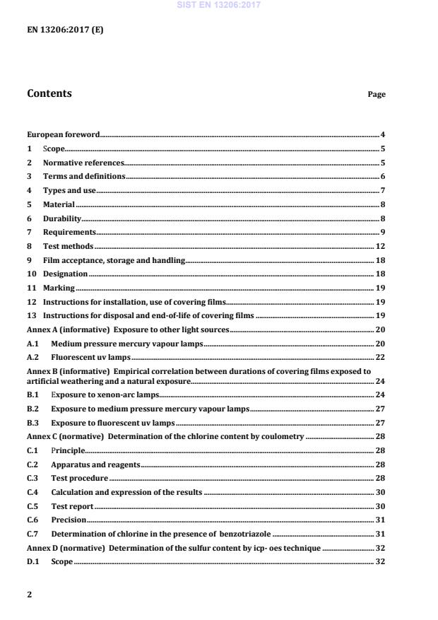 — the test methods have been updated as appropriate; — this revision specifies also test methods for the determination of the chlorine and sulfur contents of the films subjected to use and defines guidelines for installation, use and disposal; — the classification for the durability of the covering films is extended to a further class. Attention is drawn to the possibility that some of the elements of this document may be the subject of patent rights. CEN [and/or CENELEC] shall not be held responsible for identifying any or all such patent rights. According to the CEN/CENELEC Internal Regulations, the national standards organizations of the following countries are bound to implement this European Standard: Austria, Belgium, Bulgaria, Croatia, Cyprus, Czech Republic, Denmark, Estonia, Finland, Former Yugoslav Republic of Macedonia, France, Germany, Greece, Hungary, Iceland, Ireland, Italy, Latvia, Lithuania, Luxembourg, Malta, Netherlands, Norway, Poland, Portugal, Romania, Serbia, Slovakia, Slovenia, Spain, Sweden, Switzerland, Turkey and the United Kingdom. SIST EN 13206:2017