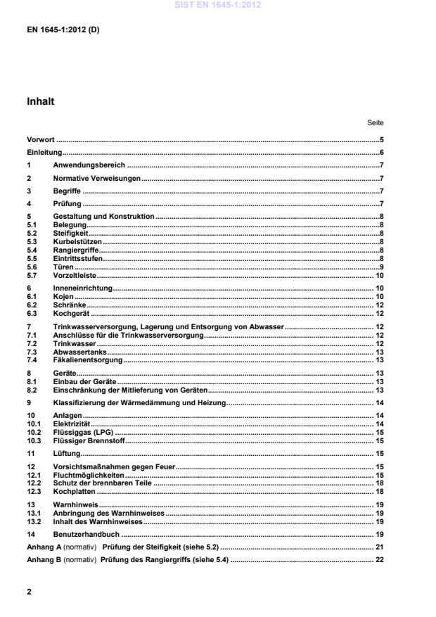 Detailed specifications Overall caravan body dimensions including shipping length. Data specified in EN 1645-2. Maximum static load at the coupling head. Explanation of thermal insulation and heating grade. Systems, appliances and equipment Systems diagrams, user instructions, safety precautions and, where applicable, input in kilowatts of appliances, for the following systems, appliances and equipment: location of emergency exits; toilet waste disposal; circuit diagrams for low voltage and extra low voltage electricity; liquefied petroleum gas; drinking water supply and waste water drainage; ventilation, to include location of openings and method of cleaning any protective screens; heating. When no heating appliances have been factory installed but space and connections have been provided for them, the recommended room-sealed type and rated power of such appliances shall be stated. If no refrigerator has been fitted, but space has been provided for one to be fitted later, indicate in the handbook in addition to the dimensions of this space, the provisions which have been made to connect the refrigerator to the electrical and/or gas installations. Other operating instructions How to connect and disconnect gas cylinders or containers. Awning spaces and their use when discharging products of combustion exhaust into them. Limitation on use of corner steadies. Maintenance Recommendations for periodic maintenance of the caravan bodywork, windows, doors, fittings, systems and appliances. A statement worded as follows: "In the interest of safety, replacement parts for an appliance shall conform to the appliance manufacturer's specifications and should be fitted by him or his authorized agent". Warning instructions These shall recommend the following: use upper bunks for sleeping only, with protection against falling out in position; care shall be taken against the risk of falling out, when upper bunks are used by children, especially under 6 years of age. These bunks are not suitable for the use by infants without supervision; do not obstruct ventilation; inspect flexible gas hose(s) regularly for deterioration and renew, as necessary, with the approved type, in any case not later than the expiration date marked on the hose(s); provide one dry powder fire extinguisher of an approved type or complying with EN 3-7 of at least 1 kg capacity by the main exit door, and a fire blanket next to the cooker. Familiarise yourself with the instructions on your fire extinguisher and the local fire precaution arrangements; NEVER use portable cooking or heating equipment, other than electric heaters that are not of the direct radiant type, as it is a fire and asphyxiation hazard; NEVER allow modification of electrical or LPG systems and appliances except by qualified persons. Care should be taken that any additional equipment or appliances are installed in accordance with the appliance/equipment manufacturer's instructions (e. g. air conditioning, satellite dish, bicycle rack, fuel cells). The manufacturer shall inform the caravan user that heavy and/or voluminous items (e.g. TV, radio, etc.) shall be stored securely before travelling. In addition, a list of safety measures to be taken before travelling, which shall include: TURN OFF ALL GAS APPLIANCES, EXCEPT THOSE HEATING APPLIANCES DESIGNED TO FUNCTION WHILE THE VEHICLE IS IN MOTION. SIST EN 1645-1:2012