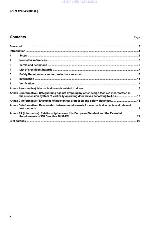 prEN 12604 - Industrial, commercial and garage doors and gates: Mechanical aspects - Requirements (CEN draft) defines mechanical, structural and safety requirements for doors, gates and barriers intended for installation where people can reach them. It applies to manually or power-operated products used to give safe access for goods, vehicles and people in industrial, commercial and residential premises. The standard addresses all significant mechanical hazards (see Annex A) and sets requirements to eliminate or minimise risk. Not covered: sizing/calculation of drive units and doors forming part of the building’s load‑bearing structure.