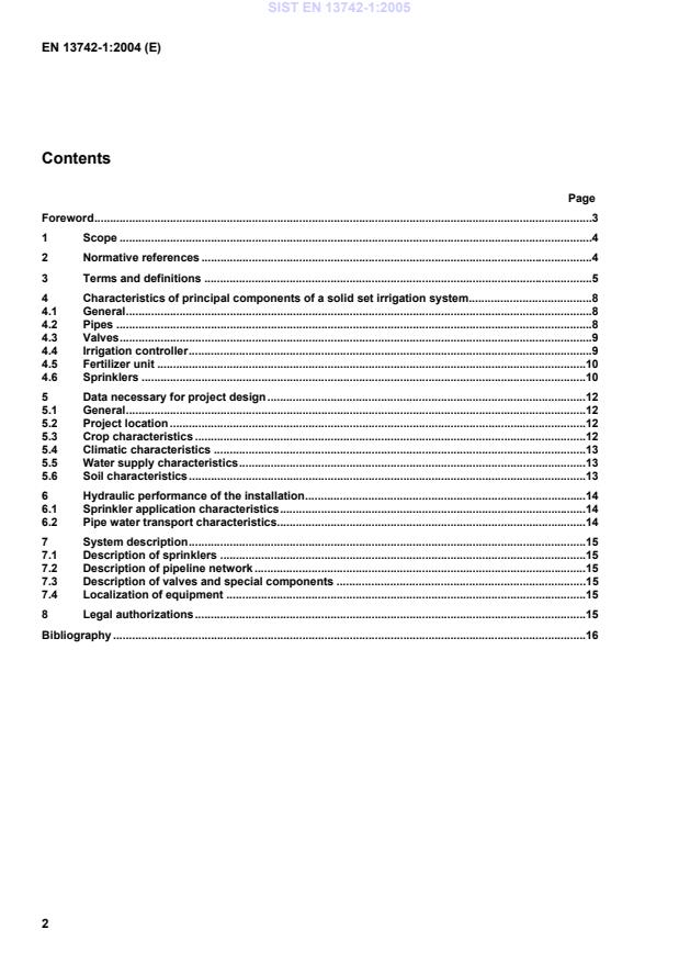 This document provides guidelines to choose material, to design, to prepare plans, and to install a solid set irrigation system to apply water to the irrigated area with the greatest possible efficiency. This document covers sprinkler irrigation systems installed at the beginning of the irrigation season and removed at the end without moving any component, sprinkler or pipe, during the entire irrigation season. It covers only solid set system components located on the field and upstream from a water supply point defined by a pressure and a flow. This document does not cover permanent systems with buried pipes nor hand-movable portable systems.
