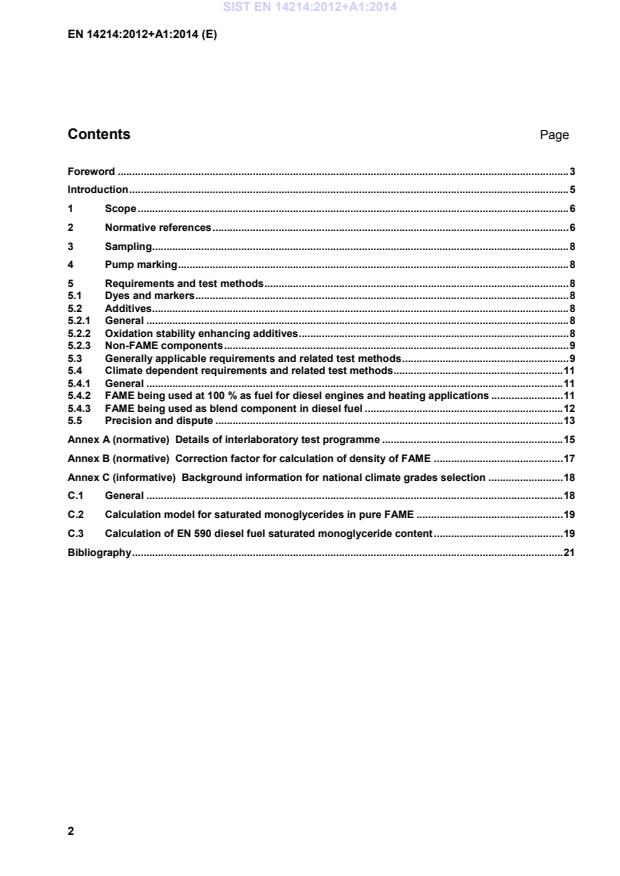 Background information for national climate grades selection . 18 C.1 General . 18 C.2 Calculation model for saturated monoglycerides in pure FAME . 19 C.3 Calculation of EN 590 diesel fuel saturated monoglyceride content . 19 Bibliography . 21 SIST EN 14214:2012+A1:2014