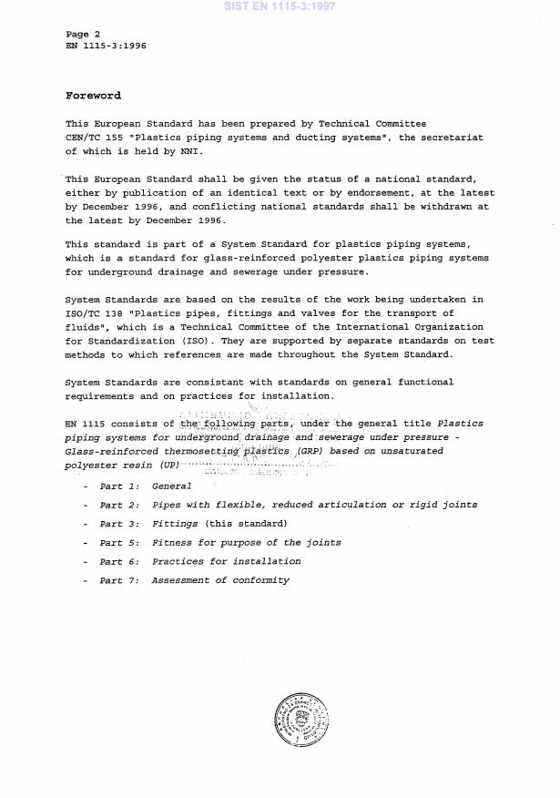 EN 1115-3:1996 is a standard published by the European Committee for Standardization (CEN). Its full title is "Plastics piping systems for underground drainage and sewerage under pressure - Glass-reinforced thermosetting plastics (GRP) based on unsaturated polyester resin (UP) - Part 3: Fittings". This standard covers: This part of prEN 1115 specifies the characteristics of fittings made from glass-reinforced thermosetting plastics pipes or moulded based on polyester resin (GRP-UP) intended to be used in underground drainage and sewerage under pressure. It also specifies the test parameters for the test methods referred to in this standard. It is applicable to fittings intended to be used for the conveyance of surface water or sewerage under pressure, below ground, outside buildings, at temperatures up to 50 °C.