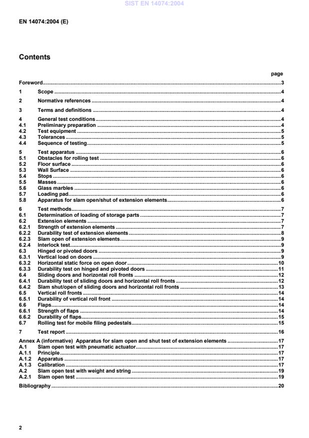 3 Terms and definitions For the purposes of this document, the following terms and definitions apply. 3.1 catch device device, which keeps or pulls a component in place, but does not require a second action in order to release it, e.g. a magnetic catch or a self-closing-mechanism 3.2 locking mechanism mechanism that limits access to the interior of a unit or a storage element. It requires a key or a combination in order to operate it or to make it possible to operate it. 4 General test conditions 4.1 Preliminary preparation The tests specified in this Standard are designed to be applied to an item of furniture that is fully assembled and ready for use. The tests refer to furniture parts with conventional functions. Combination of tests may be necessary to cover the properties of multi-function parts, e.g. a shelf that can be pulled out on runners shall be tested for strength of shelf supports as well as for strength as an extension element. Before any of the tests are commenced, the item shall be old enough to ensure that it has developed its full strength. SIST EN 14074:2004
