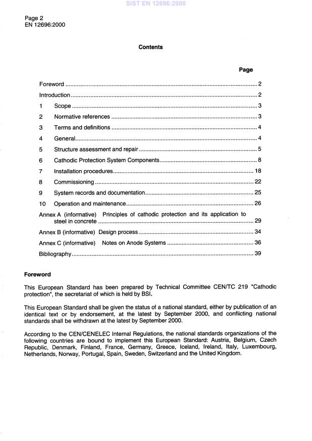 EN 12696:2000 is a standard published by the European Committee for Standardization (CEN). Its full title is "Cathodic protection of steel in concrete". This standard covers: This European Standard specifies performance requirements for cathodic protection of steel in atmospherically exposed concrete, in both new and existing structures. It covers the atmospherically exposed parts of building and civil engineering structures, including normal reinforcement and prestressed reinforcement embedded in the concrete. It is applicable to uncoated steel reinforcement and to organic coated steel reinforcement.