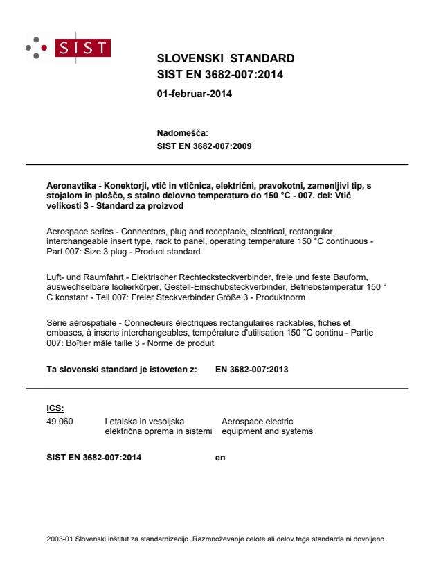 2003-01.Slovenski inštitut za standardizacijo. Razmnoževanje celote ali delov tega standarda ni dovoljeno.Luft- und Raumfahrt - Elektrischer Rechtecksteckverbinder, freie und feste Bauform, auswechselbare Isolierkörper, Gestell-Einschubsteckverbinder, Betriebstemperatur 150 °C konstant - Teil 007: Freier Steckverbinder Größe 3 - ProduktnormSérie aérospatiale - Connecteurs électriques rectangulaires rackables, fiches et embases, à inserts interchangeables, température d'utilisation 150 °C continu - Partie 007: Boîtier mâle taille 3 - Norme de produitAerospace series - Connectors, plug and receptacle, electrical, rectangular, interchangeable insert type, rack to panel, operating temperature 150 °C continuous - Part 007: Size 3 plug - Product standard49.060Aerospace electric equipment and systemsICS:Ta slovenski standard je istoveten z:EN 3682-007:2013SIST EN 3682-007:2014en01-februar-2014SIST EN 3682-007:2014SLOVENSKI