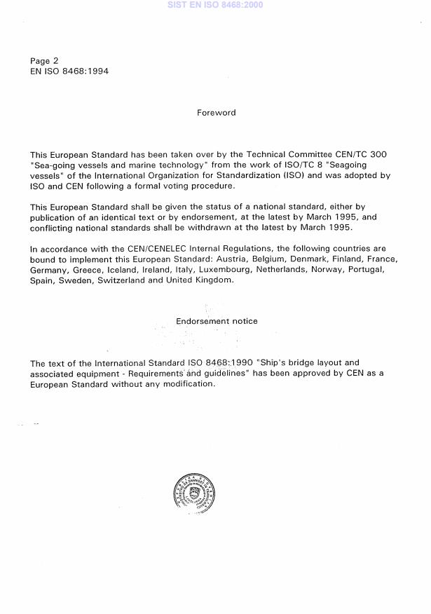 EN ISO 8468:1994 is a standard published by the European Committee for Standardization (CEN). Its full title is "Ship's bridge layout and associated equipment - Requirements and guidelines (ISO 8468:1990)". This standard covers: Diese Internationale Norm legt grundlegende funktionelle Anforderungen an Brückengestaltung, -ausrüstung und -umfeld fest. Sie wurde ausgearbeitet, damit die Gestaltung von Schiffsbrücken den Anforderungen einer sicheren Schiffsführung genügt und Unsicherheiten, die durch ungewöhnliche Anforderungen entstehen, vermieden werden.