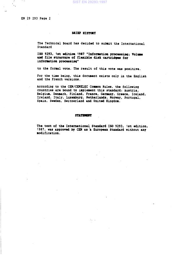 __ ~~ INTERNATIONAL STANDARD IS0 9293 : 1987 (E) Information processing - Volume and file structure of flexible disk cartridges for information interchange Section one : General O Introduction For many purposes IS0 7665 provides a satisfactory data inter- change between different types of information-processing systems. However, it imposes some restrictions on the opera- tion of a system as follows : a) Each individual file must be recorded on the disk in a se- quential, "batch-processing" mode. After a set of files has been recorded on the disk, a file cannot be extended beyond its pre-determined length. It is common practice in small systems for the user to inter- act continuously with the system to update files. Files having a suitable structure for this purpose are not within the provision of IS0 7665. The interchange cartridge has to be created by an "export" copy process from the application's files, after the applica- tion has terminated. A similar "import" process is required in the receiving system. b) Limitations on the number of file labels permitted on an interchange FDC prevents the full use of the disk space if the average size of files is significantly less than, say 20 kbytes. For conventional data processing purposes this is usually satisfactory. However, the file sizes typically en- countered in text processing and small single-user systems are very much smaller and would lead to very inefficient use of the disk space. In view of these requirements it was decided to develop a second standard for volume and file structure of flexible disk cartridges, the provisions of which were to be based on already existing practice in general use world-wide. Hence this Inter- national Standard has the following beneficial characteristics, in addition to those of IS0 7665. - The interchange file will be especially for direct updating by interactive application. - There will be no limit on the number of individual files on an FDC, within the overall limitation of available space for holding files. Any file can be extended whenever required. These characteristics are advantageous for : - interchange of sets of text files or of small files, or of multiple-part document files; - interchange of any file when sender and recipient wish to carry out frequent update of the file between interchange cycles, for example files of commercial transactions. 1 Scope and field of application This International Standard specifies the volume and file struc- ture of flexible disk cartridges (FDC) for the interchange of information between users of information processing systems. It also specifies an optional record structure. This International Standard is applicable to various types of flexible disk cartridges including those identified in clause 3, and other types which may be the subject of future Inter- national Standards. This International Standard specifies the location of files of in- formation on a flexible disk cartridge, and also specifies a set of recorded descriptors which identifies : - the files which may be interchanged; - the locations of the files: - the attributes of the files; - the location of unused space for recording on the FDC; - the location of defective recording space on the FDC; - the attributes of the FDC and of the descriptors recorded on it. This International Standard also specifies requirements for the processes which are provided within information processing systems to enable information to be interchanged between dif- ferent systems, utilizing recorded flexible disk cartridges as the medium of interchange. For this purpose it specifies the func- tions within systems which are intended to originate or to receive flexible disk cartridges which conform to this Inter- national Standard. This International Standard provides a method for the alloca- tion of space that is independent of the number of files that are recorded on the volume, It also enables the sizes of the record- ed files to be expanded or contracted during processing, sub- ject only to the availability of unused recording space when needed. 1 SIST EN 29293:1997