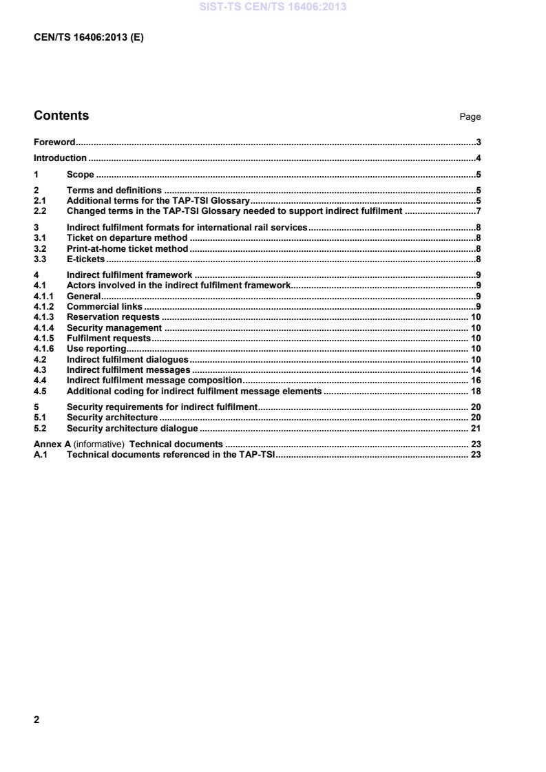 CEN/TS 16406:2013 is a technical specification published by the European Committee for Standardization (CEN). Its full title is "Intelligent transport systems - Public transport - Indirect Fulfilment for Rail". This standard covers: This Technical Specification provides, in Clause 2, new and changed glossary items needed to define indirect fulfilment and its characteristics and to support the changes to the TAP-TSI and ERA Technical Document B5. Clause 3 defines the layout formats used for international rail services fulfilled using the ticket on departure and print-at-home ticket methods. Clause 4 provides the changes to ERA Technical Document B5 that are required to provide the generic indirect fulfilment framework, covering ticket on departure, print-at-home and e-ticket fulfilment methods, although the main use of the specification is expected to be for ticket on departure. Clause 5 provides the analysis of the security requirements of indirect fulfilment, and the conclusion that no rail-specific specifications are needed.