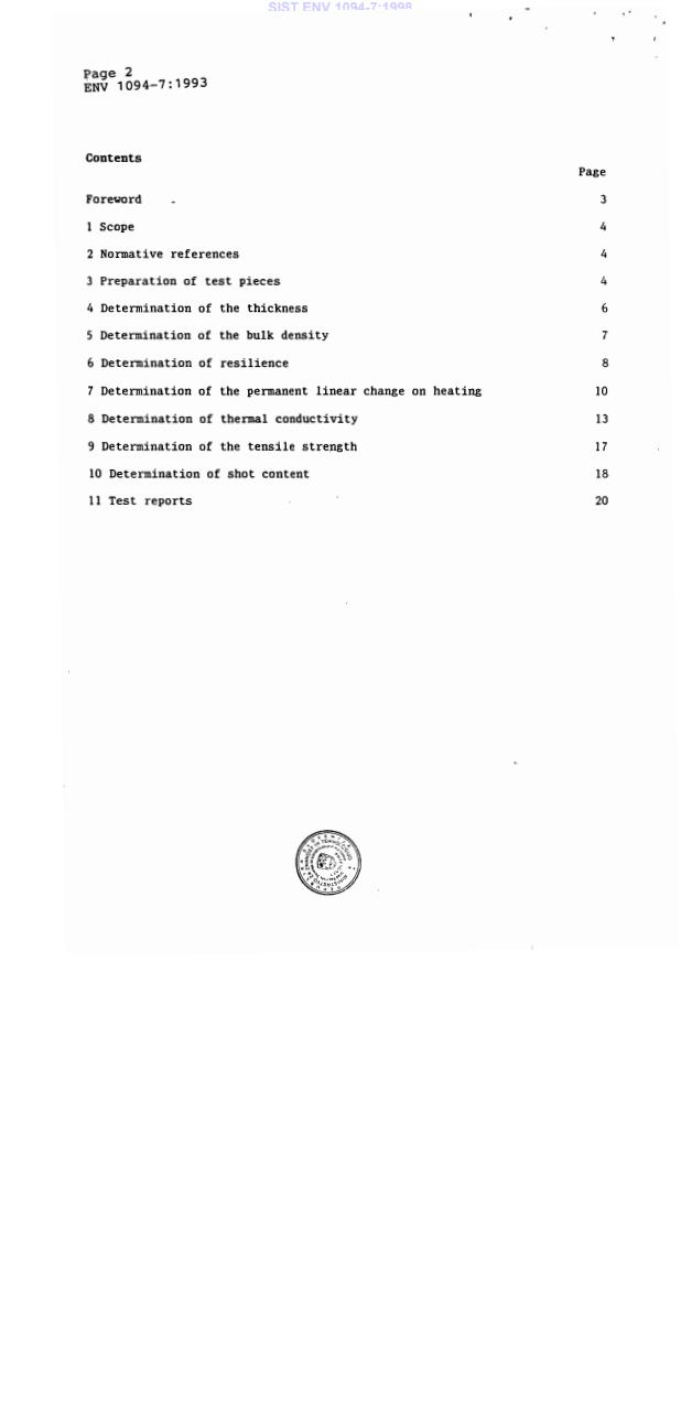 ENV 1094-7:1993 is a standardization document published by the European Committee for Standardization (CEN). Its full title is "Insulating refractory products - Part 7: Methods of test for ceramic fibre products". This standard covers: Migrated from Progress Sheet (TC Comment) (2000-07-10): Information on ENV: ++ REAL41=199305, REAL53=199308.