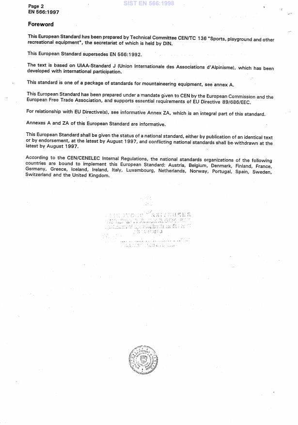 EN 566:1997 is a standard published by the European Committee for Standardization (CEN). Its full title is "Mountaineering equipment - Slings - Safety requirements and test methods". This standard covers: This European Standard specifies safety requirements and test methods for slingsused for mountaineering including climbing.