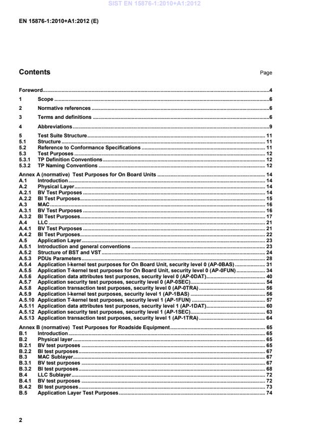 Test Purposes for Roadside Equipment . 65B.1Introduction . 65B.2Physical layer . 65B.2.1BV test purposes . 65B.2.2BI test purposes . 67B.3MAC Sublayer . 67B.3.1BV test purposes . 67B.3.2BI test purposes . 68B.4LLC Sublayer . 72B.4.1BV test purposes . 72B.4.2BI test purposes . 73B.5Application Layer Test Purposes . 74SIST EN 15876-1:2010+A1:2012
