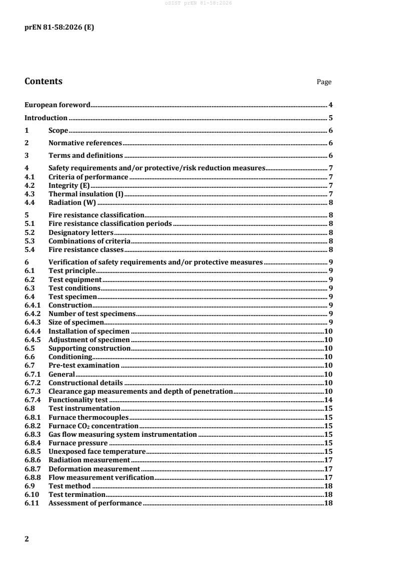 prEN 81-58:2026 is a European standard developed by CEN that specifies fire resistance requirements for lift landing doors. These landing doors are critical safety components installed at lift well openings, designed to act as a barrier to prevent the spread of fire from the landing side and through the lift well in buildings. The standard defines the necessary fire resistance levels based on integrity (E), insulation (I), and radiation (W) criteria. It also lays out the testing methods and classification criteria to verify these performance attributes. This standard updates and supersedes EN 81-58:2022, refining verifiability, marking procedures, and introducing new annexes related to testing.