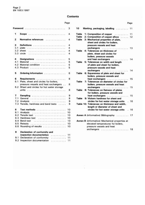 Keywords: EN 1653, copper and copper alloys, plate sheet circles, boilers, pressure vessels, heat exchangers, hot water storage units, material composition, tolerances, sampling procedures, methods of test, delivery conditions, conformity verification.