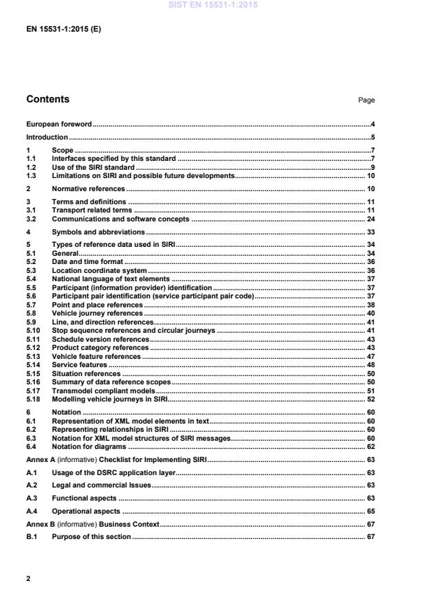 European foreword .4 Introduction .5 1 Scope .7 1.1 Interfaces specified by this standard .7 1.2 Use of the SIRI standard .9 1.3 Limitations on SIRI and possible future developments. 10 2 Normative references . 10 3 Terms and definitions . 11 3.1 Transport related terms . 11 3.2 Communications and software concepts . 24 4 Symbols and abbreviations . 33 5 Types of reference data used in SIRI . 34 5.1 General . 34 5.2 Date and time format . 36 5.3 Location coordinate system . 36 5.4 National language of text elements . 37 5.5 Participant (information provider) identification . 37 5.6 Participant pair identification (service participant pair code) . 37 5.7 Point and place references . 38 5.8 Vehicle journey references . 40 5.9 Line, and direction references . 41 5.10 Stop sequence references and circular journeys . 41 5.11 Schedule version references . 43 5.12 Product category references . 43 5.13 Vehicle feature references . 47 5.14 Service features . 48 5.15 Situation references . 50 5.16 Summary of data reference scopes . 50 5.17 Transmodel compliant models . 51 5.18 Modelling vehicle journeys in SIRI. 52 6 Notation . 60 6.1 Representation of XML model elements in text . 60 6.2 Representing relationships in SIRI . 60 6.3 Notation for XML model structures of SIRI messages. 60 6.4 Notation for diagrams . 62 Annex A (informative) Checklist for Implementing SIRI . 63 A.1 Usage of the DSRC application layer. 63 A.2 Legal and commercial Issues . 63 A.3 Functional aspects . 63 A.4 Operational aspects . 65 Annex B (informative) Business Context . 67 B.1 Purpose of this section . 67 SIST EN 15531-1:2015