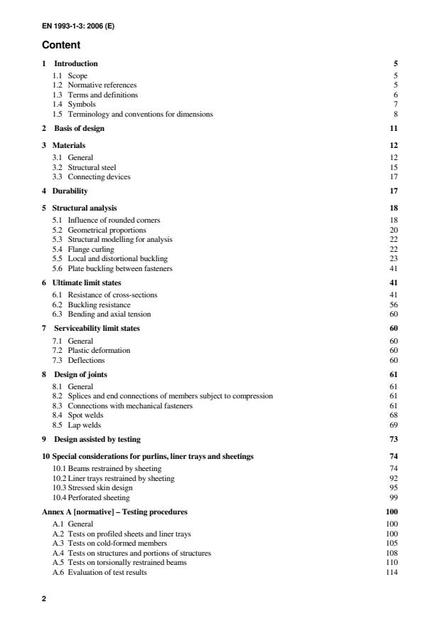 Design assisted by testing 73 10 Special considerations for purlins, liner trays and sheetings 74 10.1 Beams restrained by sheeting 74 10.2 Liner trays restrained by sheeting 92 10.3 Stressed skin design 95 10.4 Perforated sheeting 99 Annex A [normative] – Testing procedures 100 A.1 General 100 A.2 Tests on profiled sheets and liner trays 100 A.3 Tests on cold-formed members 105 A.4 Tests on structures and portions of structures 108 A.5 Tests on torsionally restrained beams 110 A.6 Evaluation of test results 114