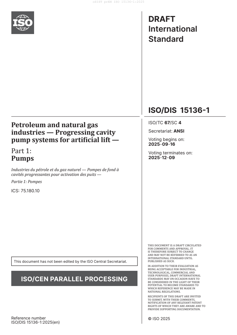 prEN ISO 15136-1 is a draft published by the European Committee for Standardization (CEN). Its full title is "Petroleum and natural gas industries - Progressing cavity pump systems for artificial lift - Part 1: Pumps (ISO/DIS 15136-1:2025)". This standard covers: ISO 15136-1:2009 provides requirements for the design, design verification and validation, manufacturing and data control, performance ratings, functional evaluation, repair, handling and storage of progressing cavity pumps for use in the petroleum and natural gas industry. ISO 15136-1:2009 is applicable to those products meeting the definition of progressing cavity pumps (PCP) included herein. Connections to the drive string and tubulars are not covered in ISO 15136-1:2009. ISO 15136-1:2009 establishes requirements for characterization and testing of stator elastomer material, design validation and functional evaluation and provides information for PCP elastomer selection and testing, installation, start-up and operation guidelines, equipment selection and application guidelines, functional specification form, used pump evaluation, drive string selection and use, repair and reconditioning procedures and auxiliary equipment. Equipment not covered by the requirements of ISO 15136-1:2009 includes bottom-drive systems except for the PCP components, drive-string components and auxiliary equipment such as tag bars, gas separators and torque anchors.