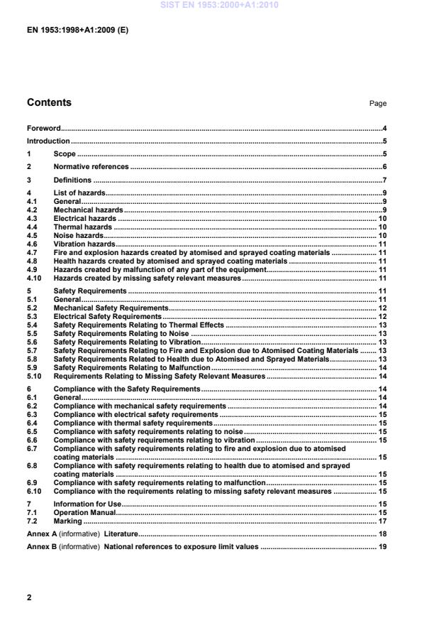 The equipment concerned and the extent to which hazards are covered is indicated in the scope of this standard. The equipment shall comply, as appropriate, with !EN ISO 12100-1 and EN ISO 12100-2" for hazards which are not covered by this standard. 1 Scope This European Standard applies to the design and construction of spraying equipment for both manual and automatic application of liquid, paste (semi-solid) and powder coating materials. The manual equipment is hand-held and the automatic equipment is operated by auxiliary signals and mounted either rigidly or onto automated devices such as robots, or reciprocating or rotary machines. The coating material may be atomised by air, by airless, by airless with the assistance of air or mechanically by centrifugal force. With atomisation by centrifugal force, the atomised coating material may be assisted towards the workpiece by controlled air veils. The atomising and spraying equipment may also be electrostatically supported. This standard specifically refers to hazards created by or resulting from the use of atomising and spraying equipment, if it is used as determined and in accordance with the foreseeable conditions of the manufacturer (see clause 4). Atomising and spraying equipment may be linked with supply systems, control circuits, spray booths and/or automated machinery, none of which are covered by the scope of this standard. This may result in the overlapping of some hazards or risks. Such hazards or risks should be taken into consideration when specifying and installing the atomising and spraying equipment. Further topics for this standard are minimum user information: Operation manuals, Marking. This standard excludes: Flocking machines; Equipment related to the atomising and spraying of foodstuffs and pharmaceuticals; Artists airbrushes; SIST EN 1953:2000+A1:2010