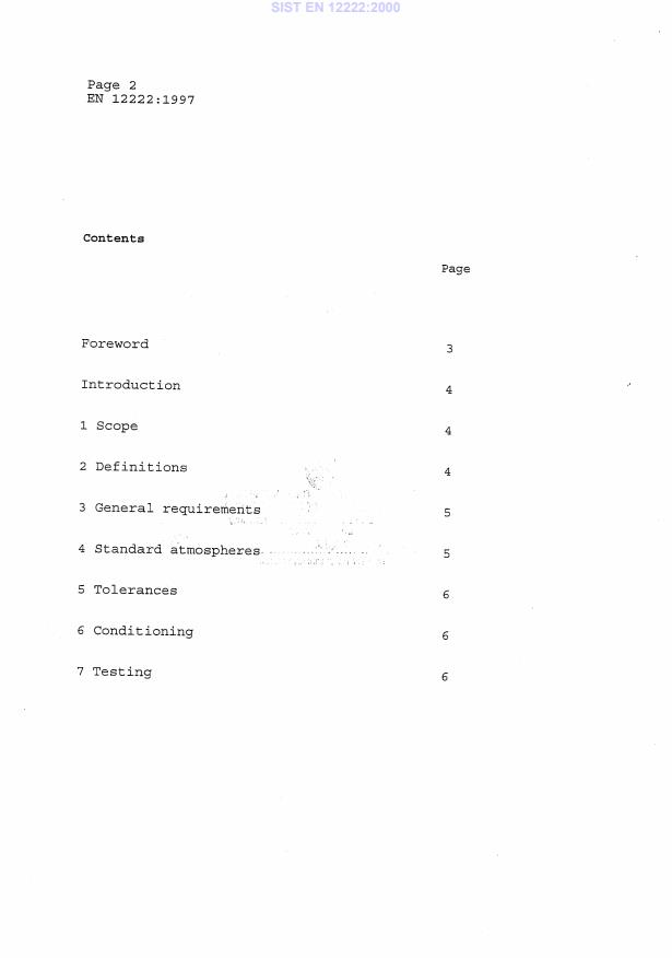 EN 12222:1997 is a CEN European Standard specifying standard atmospheres for conditioning and testing of footwear and footwear components. Adopted nationally in some countries (for example as SIST EN 12222:2000), the standard sets out general principles and two defined standard atmospheres to be used when preparing and testing shoes, insoles, uppers, soles and other components. Its purpose is to ensure reproducible, comparable test results by controlling the environmental conditions prior to and during testing.
