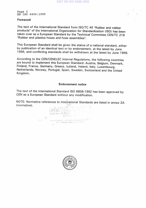 EN ISO 6806:1995 is a standard published by the European Committee for Standardization (CEN). Its full title is "Rubber hoses and hose assemblies for use in oil burners - Specification (ISO 6806:1992)". This standard covers: Specifies the minimum requirements for two types of hose assembly: hose assemblies for flux and reflux, but not for insertion between the oil burner pump and the atomizing connection, maximum working pressure 1,0 MPa (10 bar), maximum oil temperature 100 °C (type 1) and hose assemblies for insertion between the oil burner pump and the atomizing connection, working pressure 4,0 MPa (40 bar), maximum oil temperature 100 °C (type 2).