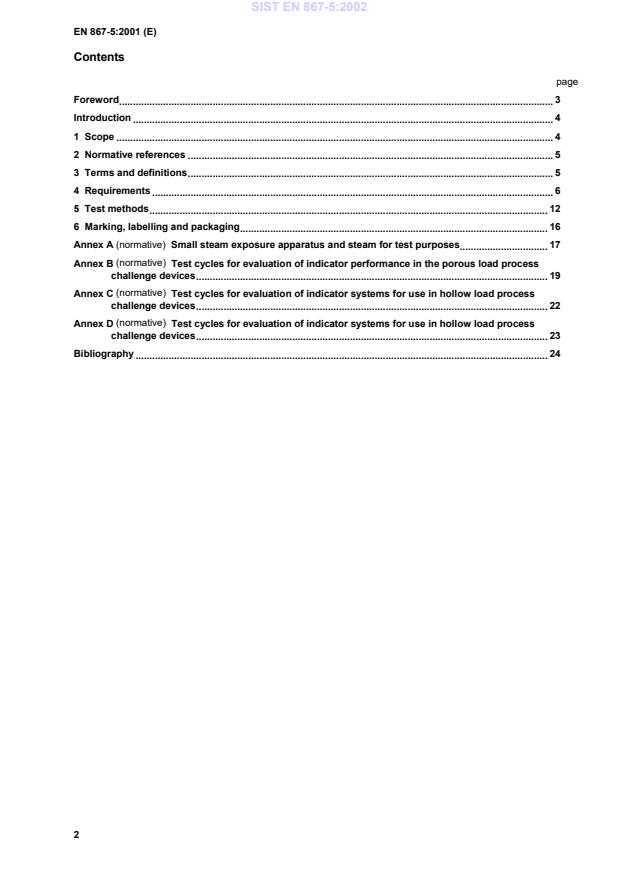 This European Standard specifies the performance requirements and test methods for non-biological indicator systems, including the process challenge devices within which they are intended to function, to be used for testing the steam penetration performance of small steam sterilizers, Type B or Type S where ap-propriate. The test systems specified are intended for use only in small steam sterilizers Type B conforming to prEN 13060-2 and having a usable chamber space greater than 10 l and for small steam sterilizers Type S conforming to prEN 13060-4 also having a usable chamber space greater than 5 l. Non-biological indicator systems and the associate process challenge devices are specified for various types of load. The possible loads are considered in two classes: Porous loads, which can be wrapped or unwrapped, or hollow instrument loads, which also can be wrapped or unwrapped. The relevant section of this European Standard on porous loads specifies the requirements for: - a standard process challenge device to be used in the small load test for porous loads in small steam sterilizers; - an indicator system for use in the porous load process challenge device. An indicator for this purpose is a Class B indicator as described in EN 867-1. - an indicator employing an alternative process challenge device equivalent to the porous load process challenge device. The relevant section of this European Standard on hollow instruments specifies the requirements for: - hollow load process challenge devices to be used to simulate hollow instrument loads as defined in prEN 13060-4; - an indicator system, for use in one of the hollow load process challenge device, for assessing steam penetration in a wrapped load of hollow instruments. An indicator for this purpose is a Class B indicator as described in EN 867-1. The process challenge devices described in this standard are intended for use only in sterilizers of sufficient size to accommodate the proces