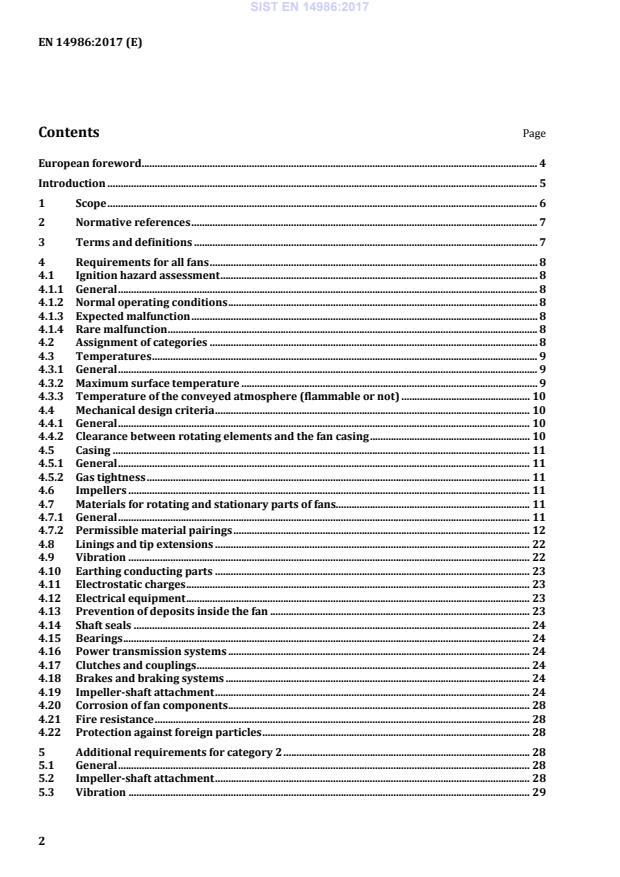 « t r °C to +60 °C, — and maximum volume fraction of 21 % oxygen content, — and an aerodynamic energy increase of less than 25 kJ/kg. NOTE 1 25 kJ/kg is equivalent to 30 kPa at inlet density of 1,2 kg/m3. This European Standard may also be helpful for the design, construction, testing and marking of fans intended for use in atmospheres outside the validity range stated above or in cases where other material pairings need to be used. In this case, the ignition risk assessment, ignition protection provided, additional testing (if necessary), manufacturer's marking, technical documentation and instructions to the user, should clearly demonstrate and indicate the equipment's suitability for the conditions the fan may encounter. This European Standard should not apply to integral fans as a part of Diesel engines, vehicles or electric motors. NOTE 2 Where undated references are used in the body of the standard the latest edition applies. SIST EN 14986:2017