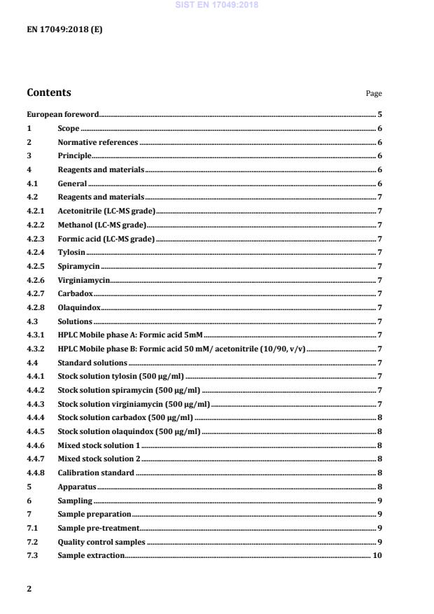 Ta evropski standard določa metodo z uporabo tekočinske kromatografije visoke ločljivosti z masno spektrometrijo (LC-MS/MS) za ugotavljanje tilozina, spiramicina, virginiamicina, karbadoksa in olakvindoksa v krmi.
