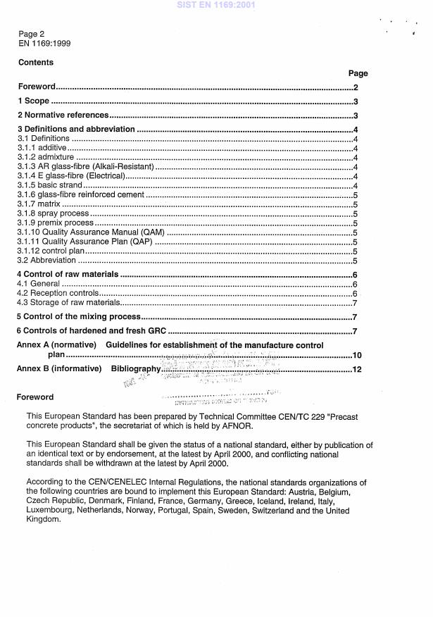 EN 1169:1999 is a standard published by the European Committee for Standardization (CEN). Its full title is "Precast concrete products - General rules for factory production control of glass-fibre reinforced cement". This standard covers: This European Standard is applicable to glass-fibre reinforced cement products manufactured in factories. It defines the general rules for production control of GRC material. It constitutes the common "production" part of the control plan, for which guidelines are given in annex A.
