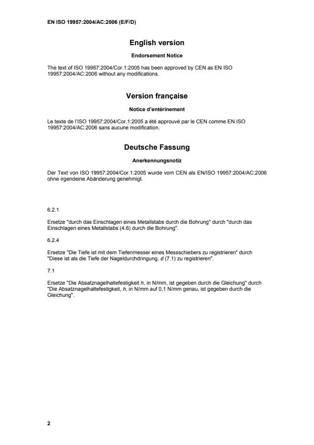 EN ISO 19957:2004/AC:2006 is a corrigendum published by the European Committee for Standardization (CEN). Its full title is "Footwear - Test methods for heels - Heel pin holding strength (ISO 19957:2004/Cor.1:2005)". This standard covers: ISO - Taking over of an ISO Technical Corrigendum