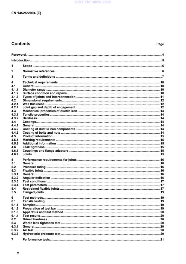 5Introduction This standard is in conformity with the general requirements already established by CEN/TC 164 in the field of water supply. In respect of potential adverse effects on the quality of water intended for human consumption, caused by the product covered by this standard : a) this standard provides no information as to whether the product may be used without restriction in any of the member states of the EU or EFTA ; b) it should be noted that, while awaiting the adoption of verifiable European criteria, existing national regulations concerning the use and/or the characteristics of this product remain in force. SIST EN 14525:2005