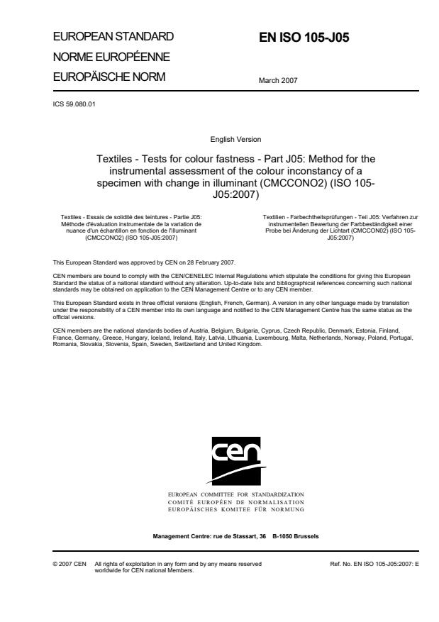 Textiles - Tests for colour fastness - Part J05: Method for the instrumental assessment of the colour inconstancy of a specimen with change in illuminant (CMCCONO2) (ISO 105-J05:2007)