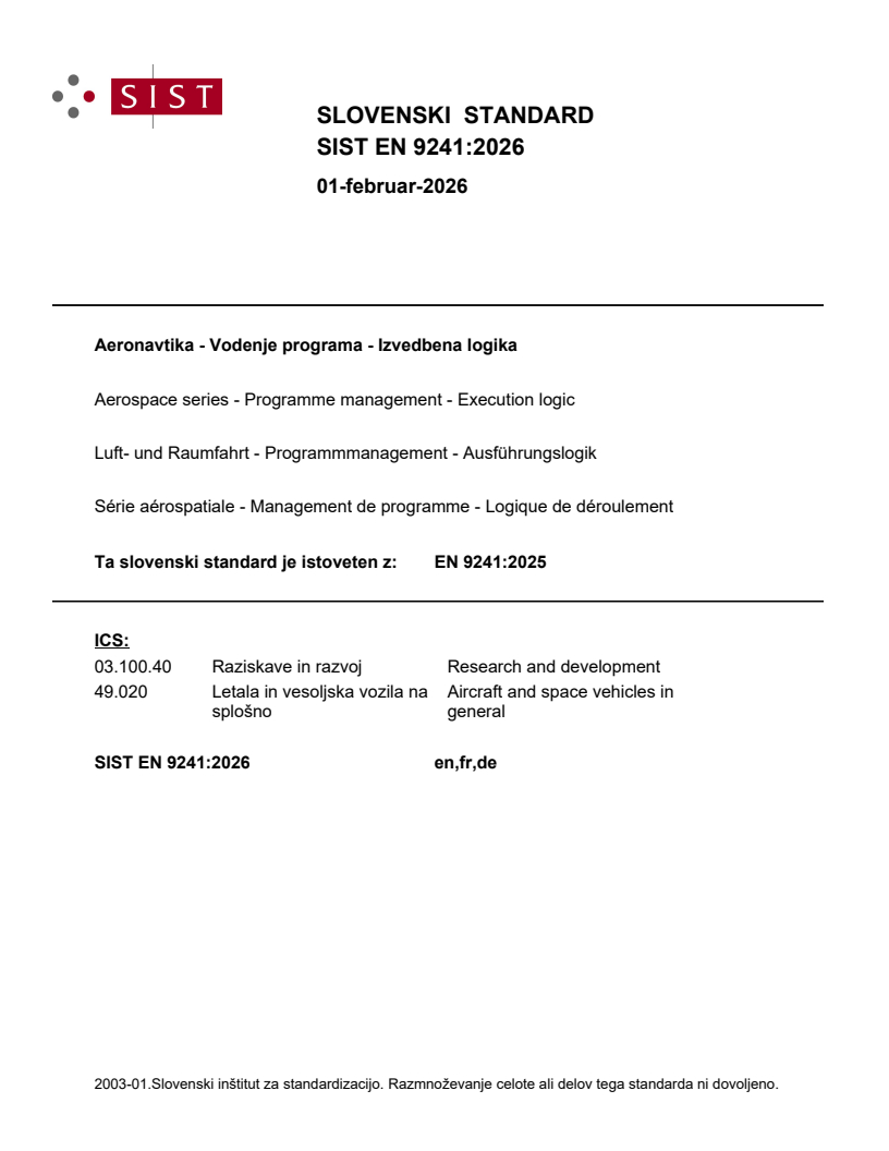 EN 9241:2025 - Aerospace series: Programme management - Execution logic (CEN) defines the principles and management requirements for elaborating a programme execution logic and drafting an execution plan for product realization. The standard supports EN 9200 (programme management specification) and applies to aeronautical, space and defence programmes (single product, prototypes or series). It aims to enable customers and suppliers to agree how processes and activities are organized, giving each actor visibility of sequencing, synchronization and decision points across the programme life cycle.