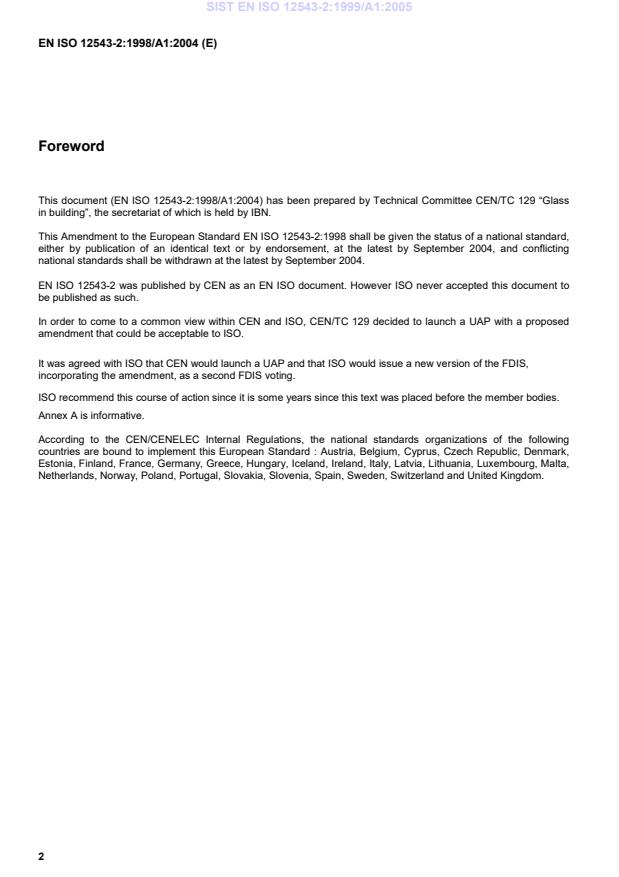 This amendment A1 modifies the European Standard EN ISO 12543-2:1998; it was approved by CEN on 4 April 2003.