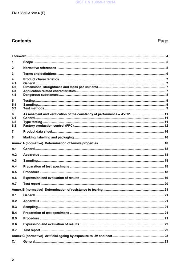 Foreword .4 1 Scope .5 2 Normative references .5 3 Terms and definitions .6 4 Product characteristics .7 4.1 General .7 4.2 Dimensions, straightness and mass per unit area .7 4.3 Application related characteristics .7 4.4 Dangerous substances .8 5 Testing .9 5.1 Sampling .9 5.2 Test methods .9 6 Assessment and verification of the constancy of performance – AVCP . 11 6.1 General . 11 6.2 Type testing . 11 6.3 Factory production control (FPC) . 12 7 Product data sheet. 16 8 Marking, labelling and packaging . 16 Annex A (normative)