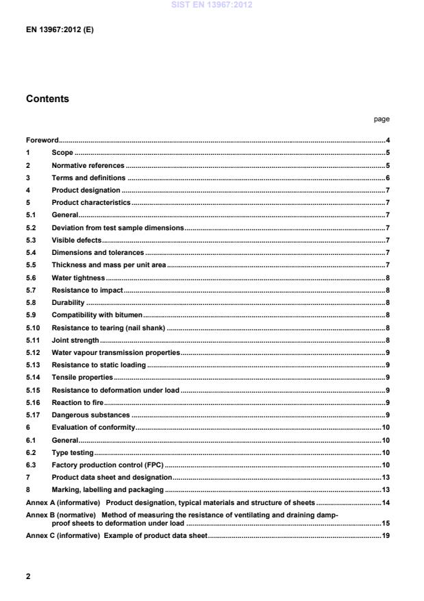 EN 13859-1:2010 and shall be greater than or equal to the manufacturer's limiting value for the longitudinal and transverse directions of the sheet. 5.15 Resistance to deformation under load The resistance of ventilating or draining damp proof sheets to deformation under load shall be determined in accordance with Annex B and the results shall be less than or equal to the manufacturer's limiting value of deformation at the defined load and the defined time. 5.16 Reaction to fire Where required, the product shall be tested and classified in accordance with EN 13501-1:2007+A1:2009, Table 1. According to EN ISO 11925-2, the test is required to be undertaken on the exposed surface of the delivered flexible sheet membrane (surface exposure), free hanging without any substrate, in one direction only. The reinforcement shall be stated by the manufacturer as “organic” or “inorganic”. a) Test results from EN ISO 11925-2 for a given product shall apply to all colors (including black and white). b) Test results from EN ISO 11925-2 for a given product without an inner layer (homogenous) shall apply to a comparable product with an additional organic inner layer (lower than 150g/m2) or any additional inorganic layer. c) Test results from EN ISO 11925-2 for a product with a thickness of above 1 mm shall apply to any comparable product with a higher thickness up to a limit of 3 mm respectively d) Test results from EN ISO 11925-2 for a given product with a backing shall apply to a comparable product with a backing of the same type of lower mass per unit area or no backing. NOTE Whether the Euroclasses Classification system at Classes D and above requires investigation to determine its appropriateness to the products covered by this document is currently under consideration. (In particular it is thought that the SBI test may be inappropriate for products covered by the standard.) Pending results of such an investigation and discussions in the Fire Experts Group, products covered by this document are tested to EN ISO 11925-2. If and when a new fire test scenario and test method are developed for the products, this document will be amended to refer to them. 5.17 Dangerous substances NOTE For products placed on the market within the European Economic Area, see ZA.1. SIST EN 13967:2012