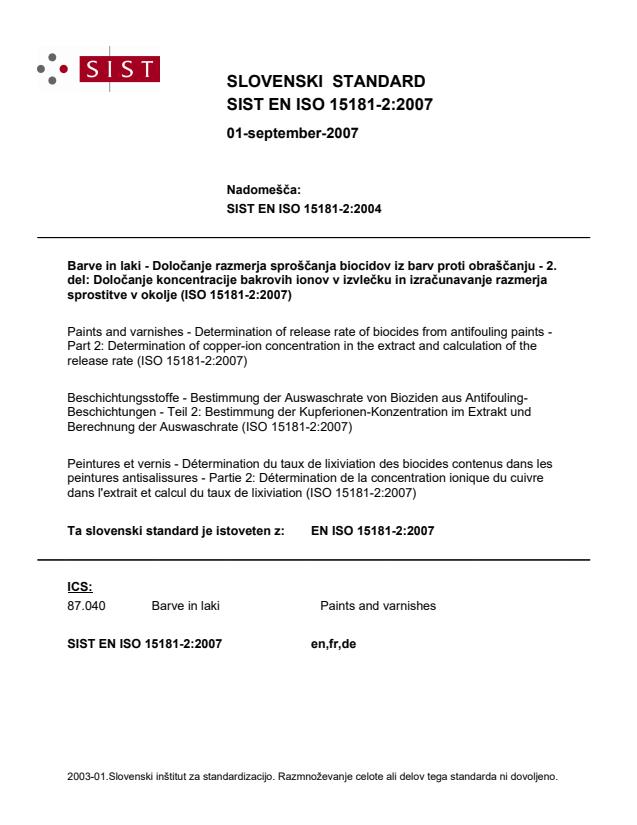 Barve in laki - Določanje razmerja sproščanja biocidov iz barv proti obraščanju - 2. del: Določanje koncentracije bakrovih ionov v izvlečku in izračunavanje razmerja sprostitve v okolje (ISO 15181-2:2007)