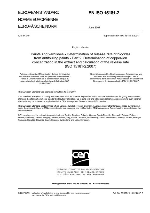 EN ISO 15181-2:2007 is a standard published by the European Committee for Standardization (CEN). Its full title is "Paints and varnishes - Determination of release rate of biocides from antifouling paints - Part 2: Determination of copper-ion concentration in the extract and calculation of the release rate (ISO 15181-2:2007)". This standard covers: ISO 15181-2:2007 specifies the apparatus and analytical method for determining the amount of copper (based) biocide that has been released from an antifouling paint into artificial seawater in accordance with the procedure given in ISO 15181-1. It determines the copper-ion concentration and gives the final calculation for the release rate of copper under the specified laboratory conditions. It is designed to generally allow the concurrent determination of copper ions and other biocides that might be released by a given antifouling paint through the analysis of separate sub-samples of an artificial seawater extract generated in accordance with the procedure given in ISO 15181-1, and analysed in accordance with the procedures given in other parts of this International Standard. When used in conjunction with ISO 15181-1, the practical limits on the quantitative measurement of release rates by this method are from 1,8 micrograms per square centimetre per day to 500 micrograms per square centimetre per day. The quantitative measurement of release rates below this range will require the use of an analytical method with a lower limit of quantitation for copper.