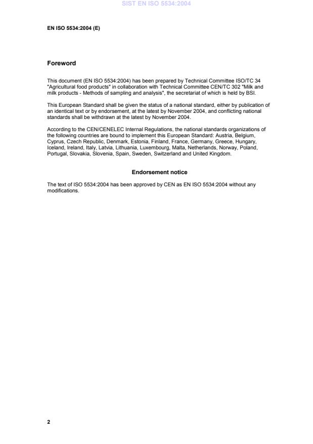 This document (EN ISO 5534:2004) has been prepared by Technical Committee ISO/TC 34 "Agricultural food products" in collaboration with Technical Committee CEN/TC 302 "Milk and milk products - Methods of sampling and analysis", the secretariat of which is held by BSI.