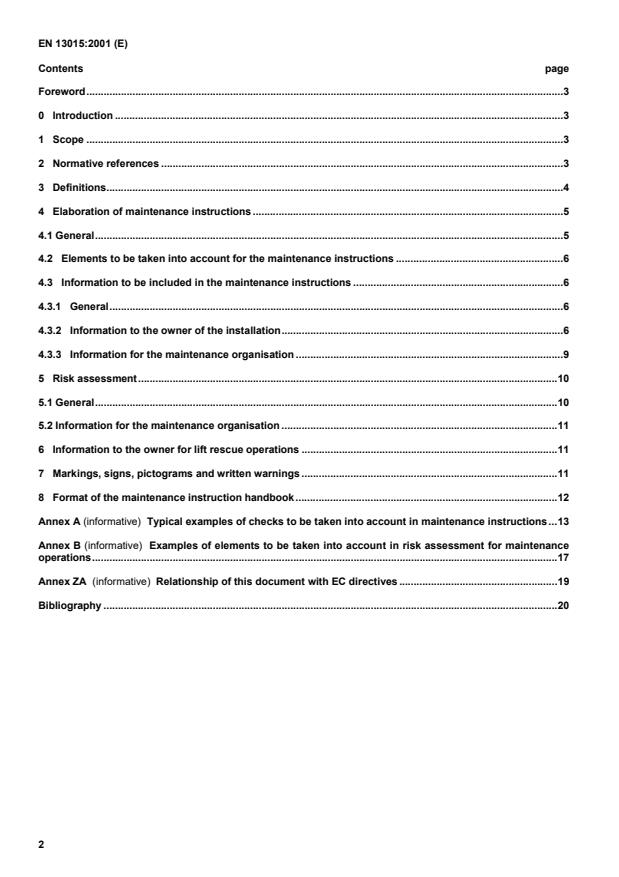 EN 13015:2001 is a standard published by the European Committee for Standardization (CEN). Its full title is "Maintenance for lifts and escalators - Rules for maintenance instructions". This standard covers: This European Standard specifies the elements necessary for the preparation of the instructions for the maintenance operations, as in 3.1, which are provided for new installed passenger lifts, goods passenger lifts, accessible goods only lifts, service lifts, escalators and passenger conveyors. This European Standard does not cover: a) instructions for the installation and the dismantling; b) any legal examinations and tests based on national regulations. Existing installations are not covered by this Standard, but it can be taken as a reference.