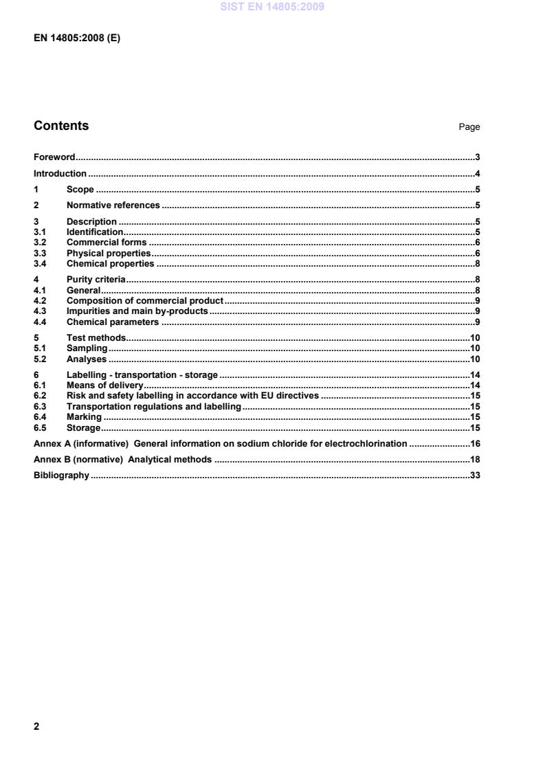 EN 901 (sodium hypochlorite) for those impurities commonly present in the product and the chemical parameters. Consideration has also been given to the requirements of EN 973 (sodium chloride) for regeneration of ion exchangers. Depending on the raw material and the manufacturing process, other impurities may be present and, if so, this shall be notified to the user and, when necessary, to relevant authorities. NOTE 1 Users of this product should check the national regulations in order to clarify whether it is of appropriate purity for the treatment of water intended for human consumption, taking into account raw water quality, required dosage, contents of other impurities and additives used in the product and not stated in this product standard. NOTE 2 Using the sodium hypochlorite standard to define limits produces discrepancies with EN 973 regarding sodium chloride for the regeneration of ion exchange water softeners. This should not be taken to imply any real difference between the chemical purity between salt types meeting either specification. Limits have been given for impurities and chemical parameters where these are likely to be present in significant quantities from the current production process and raw materials. If the production process or raw materials lead to significant quantities of impurities, by-products or additives being present, this shall be notified to the user. SIST EN 14805:2009