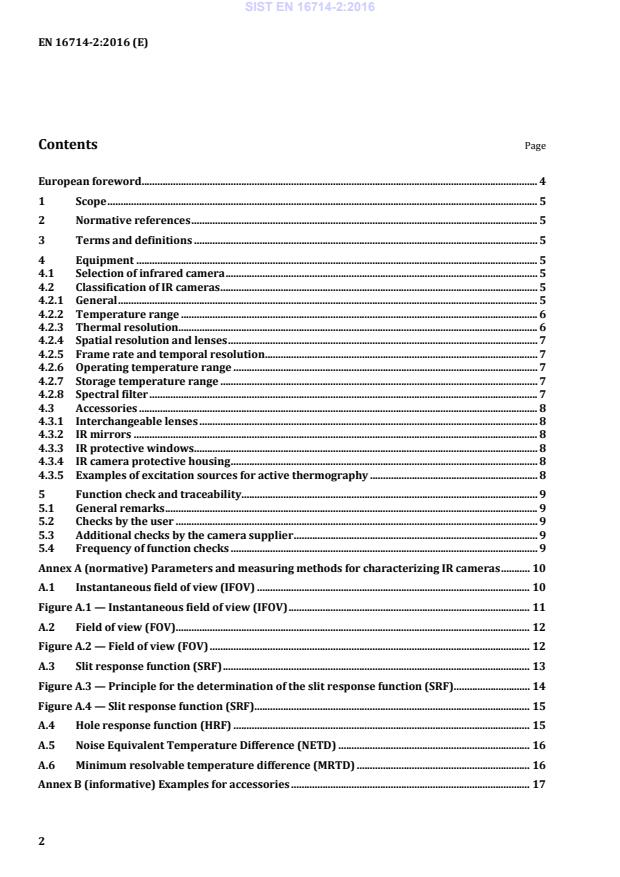 wavelength between approx. 2,0 µm and 5,0 µm; — long Wave, LW: wavelength between approx. 8,0 µm and 14,0 µm. 4.2.2 Temperature range The temperature range is the interval between lowest and highest measurable temperature. The range should be specified for black-body temperatures (emissivity = 1). NOTE 1 Temperature range means the total temperature range, which can consist of several partial measurement ranges that can be adjusted separately at the device. NOTE 2 The use of optical components like spectral filters can alter the measurable temperature range. 4.2.3 Thermal resolution The thermal resolution describes the ability of an IR camera to resolve small temperature differences. The thermal resolution is commonly described by the noise equivalent temperature difference (NETD, see A.5). The thermal resolution depends among others on: — the object temperature; — the integration time or response time; — the temperature range. Therefore, it shall be specified at least with indication of these values. The required thermal resolution depends strongly on the application. SIST EN 16714-2:2016