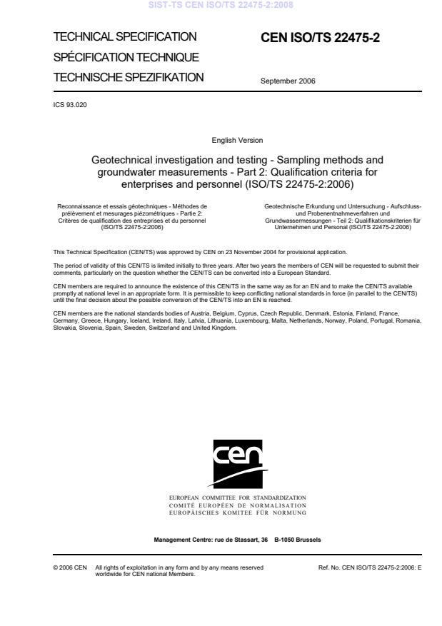 CEN ISO/TS 22475-2:2006 is a technical specification published by the European Committee for Standardization (CEN). Its full title is "Geotechnical investigation and testing - Sampling methods and groundwater measurements - Part 2: Qualification criteria for enterprises and personnel (ISO/TS 22475-2:2006)". This standard covers: ISO/TS 22475-2:2006 specifies the qualification criteria for an enterprise and personnel performing sampling and groundwater measurement services so that all have the appropriate experience, knowledge and qualifications as well as the correct equipment for and groundwater measurements for the task to be carried out according to ISO 22475-1.