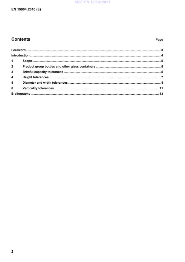 EN 15904:2010 is a standard published by the European Committee for Standardization (CEN). Its full title is "Glass packaging - Standard tolerances for flaconnage". This standard covers: This European Standard specifies the tolerances for the bottles intended to be used for pharmaceutical products, cosmetic and perfumery products and chemical products. The following tolerances are concerned: - brimful capacity; - height; - diameter and width; - verticality. The following types of bottles are excluded from this standard: - "miniatures"; - small bottles for extracts, essences, etc.; - small jars (e.g. individual portions of jam).