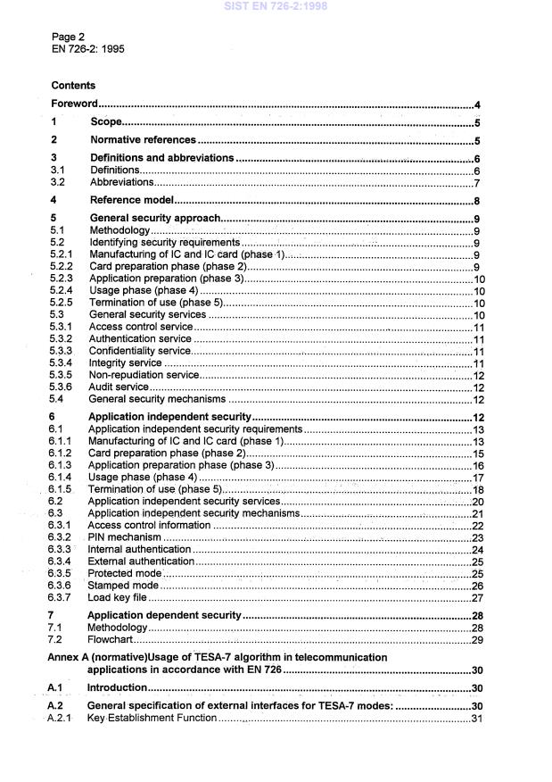 EN 726-2:1995 is a standard published by the European Committee for Standardization (CEN). Its full title is "Identification card systems - Telecommunications integrated circuit(s) cards and terminals - Part 2: Security framework". This standard covers: This part of EN 726 specifies a security framework for telecommunication use of IC cards. This specification does not describe any implementation details. It describes: - a general security approach resulting in a methodology, different card phases for identifying security requirements and a description of security services which can be offered by the IC card.