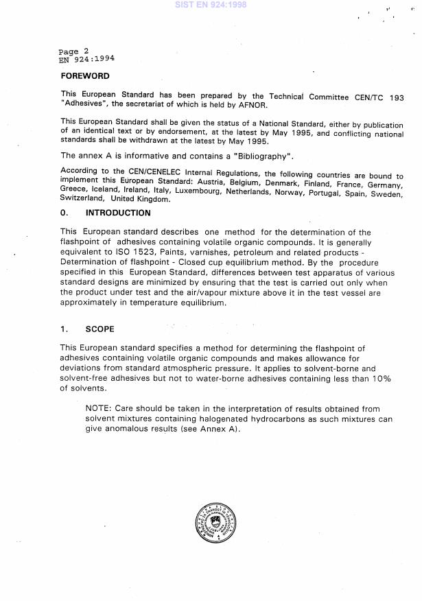 EN 924:1994 is a standard published by the European Committee for Standardization (CEN). Its full title is "Adhesives - Solvent-borne and solvent-free adhesives - Determination of flashpoint". This standard covers: This European standard specifies a method for determining the flashpoint of adhesives containing volatile organic compounds and makes allowance for deviations from standard atmospheric pressure. It applies to solvent-borne and solvent-free adhesives but not to water-borne adhesives containing less than 10%of solvents.