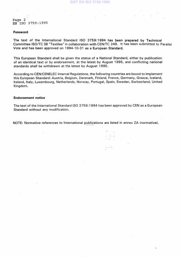 EN ISO 3759:1995 is a standard published by the European Committee for Standardization (CEN). Its full title is "Textiles - Preparation, marking and measuring of fabric specimens and garments in tests for determination of dimensional change (ISO 3759:1994)". This standard covers: Die vorliegende Internationale Norm legt Verfahren fest zur Vorbereitung, Markierung und Messung von textilen Flächengebilden, Kleidungsstücken und Kombinationen von Flächengebilden zur Verwendung bei Prüfungen zur Bewertung der Maßänderung, z.B. beim Waschen, Chemisch-Reinigen, Durchnässen und Dämpfen. Die Norm ist anwendbar auf gewebte und gestrickte Flächengebilde und flachgewebte textile Erzeugnisse. Sie sind nicht anwendbar auf Erzeugnisse, die sich im Gebrauch leicht dehnen, z.B. Polsterbezüge und Artikel aus Maschenwaren.