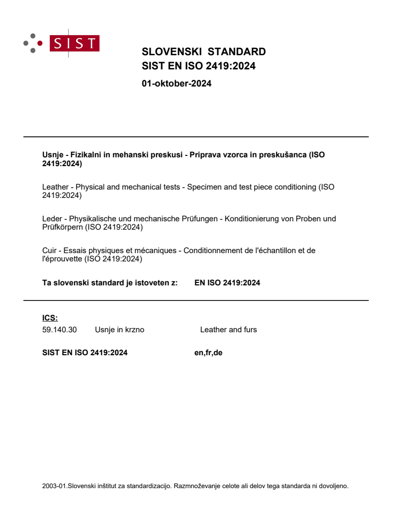Keywords: EN ISO 2419:2024, ISO 2419, leather conditioning, specimen conditioning, standard atmosphere, leather testing, physical and mechanical tests, IULTCS, CEN.