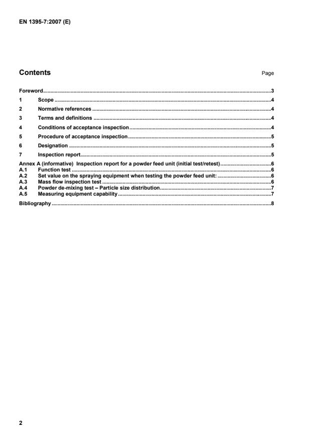 Inspection report for a powder feed unit (initial test/retest).6 A.1 Function test.6 A.2 Set value on the spraying equipment when testing the powder feed unit:.6 A.3 Mass flow inspection test.6 A.4 Powder de-mixing test – Particle size distribution.7 A.5 Measuring equipment capability.7 Bibliography.8